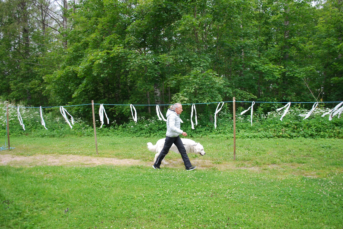 Kahden 20 metrin etäisyydellä toisistaan olevan paalun väliin on kiinnitetty naru. Naruun on ripustettu 50 cm pituisia muovinauhoja, jotka lepattavat tuulessa. Koirakko kävelee paalulta toiselle ja palaa takaisin toista puolta.